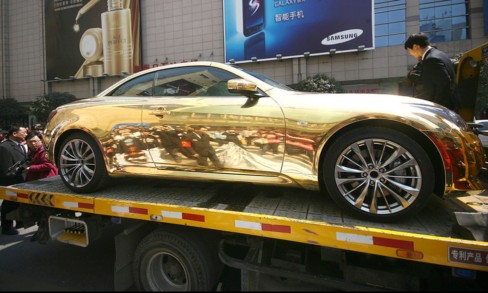 2011年3月29日,一輛車身鍍金的“黃金跑車”停在南京一商場門口,車主停好車后隨即離去,過了約10分鐘,“黃金拖車”被交警以違章停車拖走。